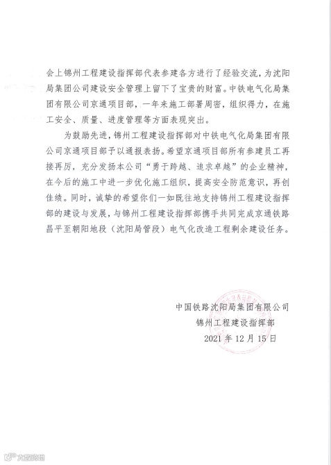 12月15日,沈阳电化公司京通项目部收到中国铁路沈阳局集团锦州工程建设指挥部一封表扬通报。通报充分肯定了项目部在项目建设工作中所做出的努力和贡献,对奋斗在京通项目建设的全体员工提出通报表扬。