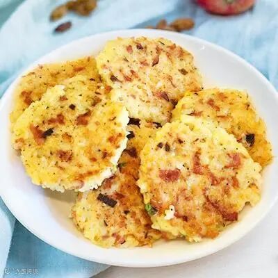 4、在平底锅内刷上一点油,油热后,把调制好的米饭放进锅内,用小火进行煎炸,等一面煎成金黄色,翻面煎,两面都煎成金黄色即可。