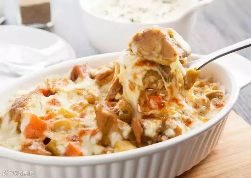 6、盛入碗中,在上面均匀撒上马苏里拉芝士碎,烤箱提前上下火200度预热,将碗放进烤箱中烤15分钟,待芝士融化上色后出炉即可。