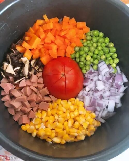 1、胡萝卜、香菇、火腿肠、洋葱切丁备用,番茄、玉米粒、豌豆粒洗净备用;