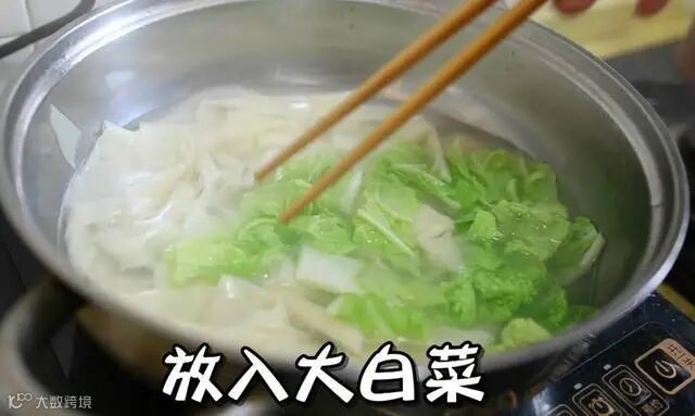 2.起锅加水烧开,饺子皮煮两分钟,放入大白菜。