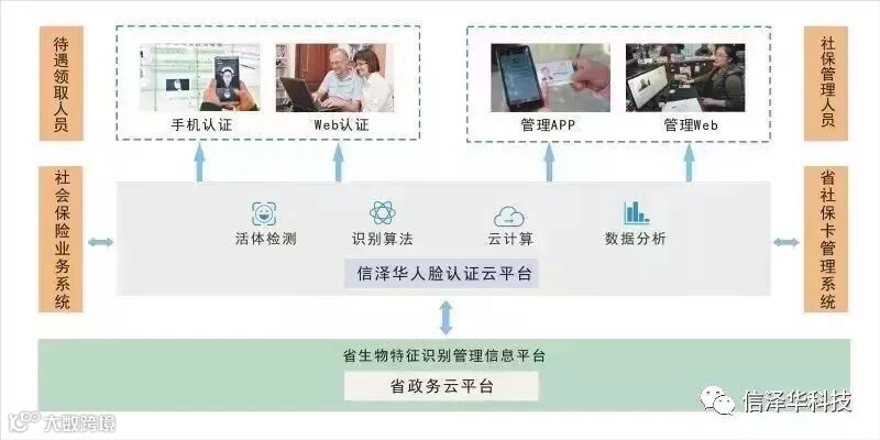 为贯彻党中央、国务院关于深入推进审批服务便民化的部署要求,信泽华社会保险人脸认证云平台以第四代人脸识别算法为核心,运用“互联网+”、云平台、大数据的设计理念,开创以人脸大数据对比为主的非集中式自主认证创新模式。