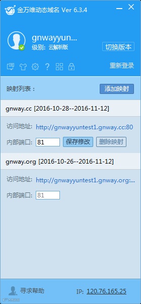 5、切换成功后重新登录客户端,点击“添加映射”进行端口设置,图中81端口为任我行CRM的应用程序端口,80为外网访问端口,如下图: