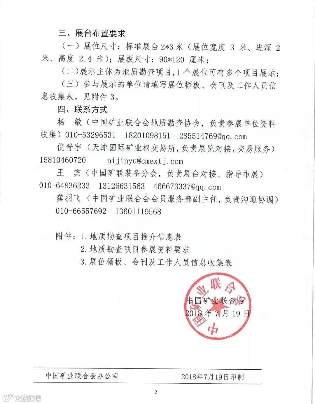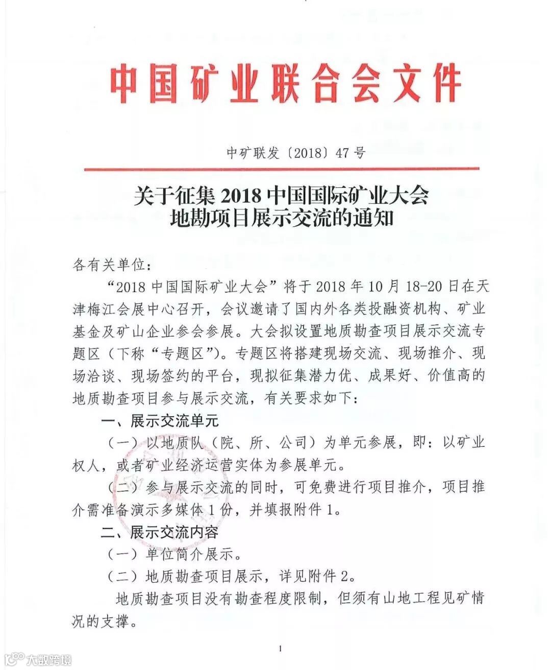 2018中国国际矿业大会将于10月18-20日在天津梅江会展中心召开。为服务地勘行业、推动项目交流合作,中国矿业联合会与天津国际矿业权交易所将联合举办地勘项目展示交流会,为矿业权人搭建现场交流、推介、洽谈、服务的平台。