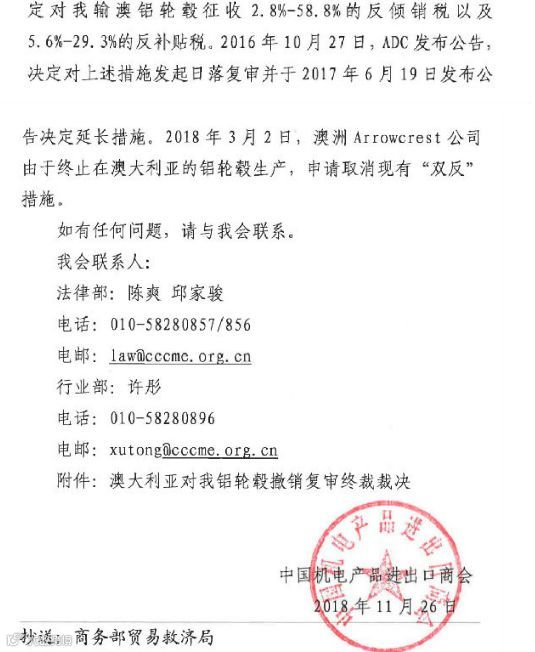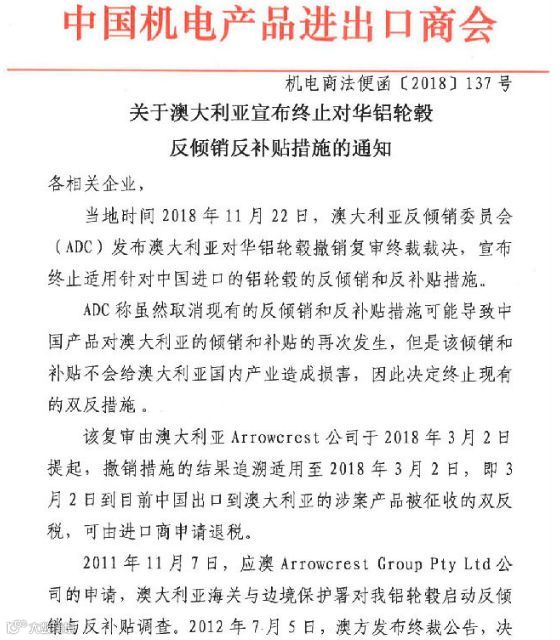 导读:澳大利亚宣布终止对华铝轮毂反倾销反补贴措施来源:中国机电产品进出口