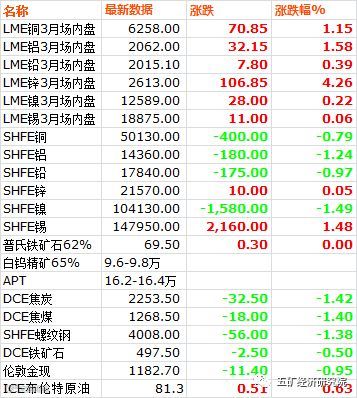 9月28日周五LME金属市场全线反弹上扬,低开高走高收,其中锌暴涨,其他金属小幅收高。三月期锌价由于前期超跌以及国内锌库存大幅下降而出现报复性反弹上扬,收于2612美元/吨,涨幅4.2%。三月期铝价收于2062美元/吨,涨幅1.6%。三月期铜价收于6259美元/吨,涨幅1.2%。