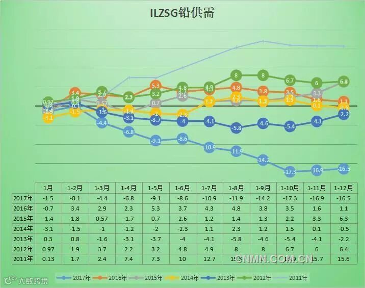 以下为ILZSG公布的2011年以来全球铅供需数据:(单位:万吨)