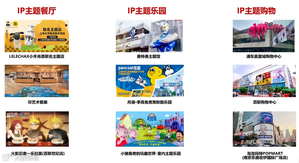 卡通动漫品类:小黄人、变形金刚、芭比、宝可梦、奥特曼系列、面包超人、小猪佩奇、史努比、东映、哆啦A 梦、小王子、海绵宝宝、ZANMENG LOOPY、超级飞侠、熊出没、猪猪侠、天官赐福等;肖像形象品类:Hello Kitty、 LINE FRIENDS、Pancoat、B.Duck、我不是胖虎、熊本熊、小蓝等;潮流时尚品类:泡泡玛特、tokidoki、52 Toys、Toycity、TNT Space、Laura、Nanci等;艺术文化(含博物馆)品类:故宫博物院、中国国家博物馆、中国文物交流中心、大英博物馆、大都会艺术博物 馆、苏州博物馆、文化和旅游部恭王府博物馆、敦煌博物馆、茅台文创等;企业品牌品类:Playboy、中航文化、中国航天、NBA、Licensing Matters、Global Trademark Licensing等;影视综艺品类:派拉蒙、传奇影业、功夫熊猫、爱奇艺、中影制片、魔豆朝上、大闹天空等;电子游戏品类:魔兽世界、网易游戏、王者荣耀、魔域、植物大战僵尸、刺客信条、恋与制作人、中手游等。