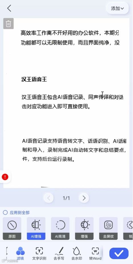 裁剪调整、画质增强、去手写、无水印、转Word、加滤镜、加标注等。