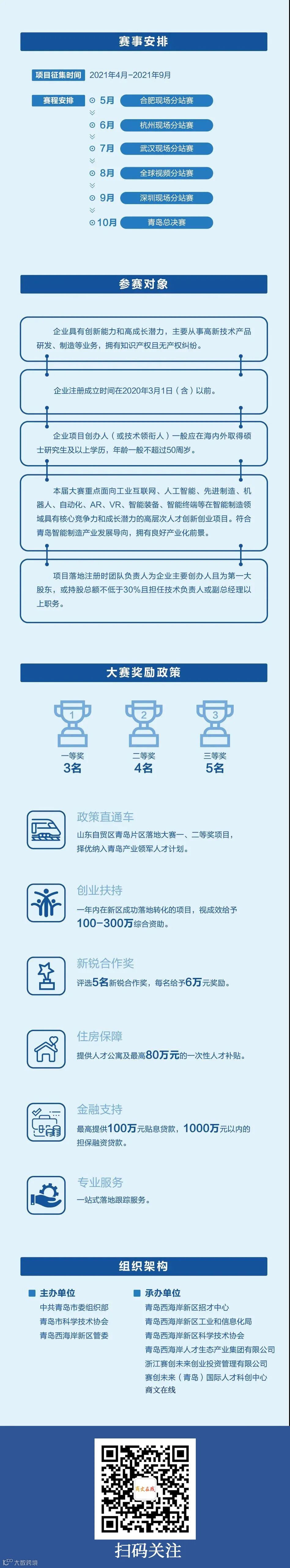 同时为了鼓励参赛的创新创业项目与青岛西海岸新区本地企业实现技术合作或应用合作,特推出“新锐合作奖”,即从本届大赛的优质项目中评选出五名获奖项目,每个项目在享受大赛政策的基础上,另获得6万元现金奖励。目前合肥、武汉、深圳、全球视频四场分站赛项目依然广泛征集中,欢迎各位创业者报名。