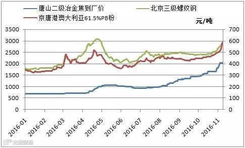 据我的钢铁网监测,截至2016年11月11日,唐山二级冶金焦到厂价2040元/吨,本月累计大涨22.5%;京唐港61.5%澳洲PB粉590元/吨,累计大涨19%。如果按此测算,唐山钢厂螺纹钢生产成本已经突破3000元/吨,考虑到前期原材料采购价略低,当前螺纹钢生产成本2800元/吨左右。