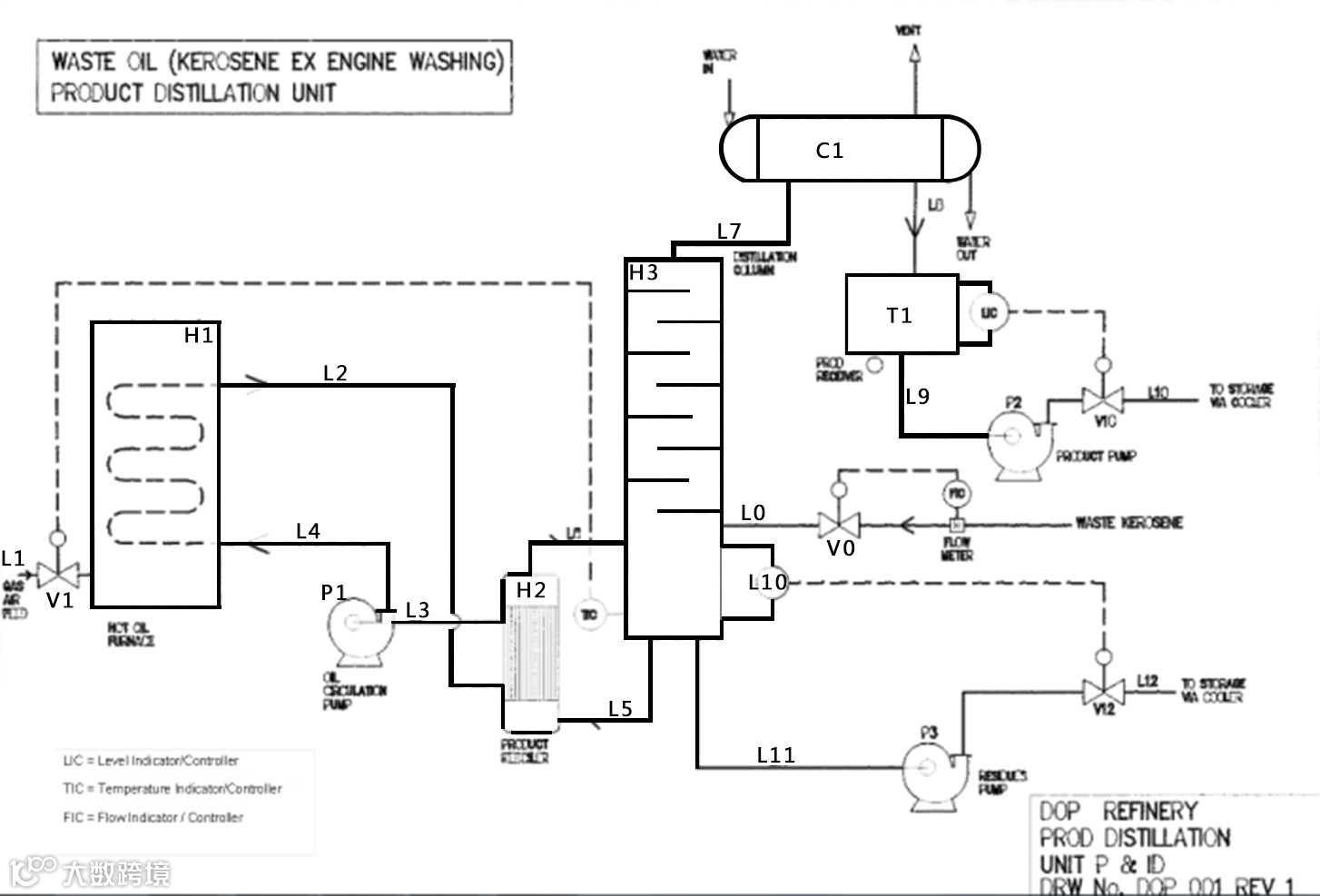 受污染的废弃煤油从积储缸(没有显示)输送至H3,由流速控制阀V0控制于指定的流速。加热液体从H1加热并由泵P1经H2 (管壳式换热器)循环于封闭的热油系统内。废弃煤油会于H2煮沸。