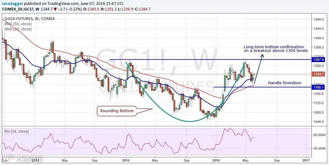 黄金的第一个上行目标为1300美元;随后的下一个目标是1400美元。从圆弧底突破的格局目标为1550美元。