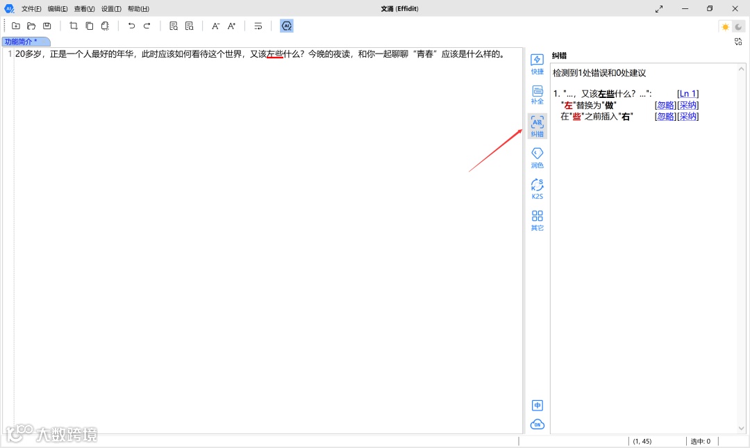 写完一篇文后,不想逐条去看语病时,可直接一键“改错”。