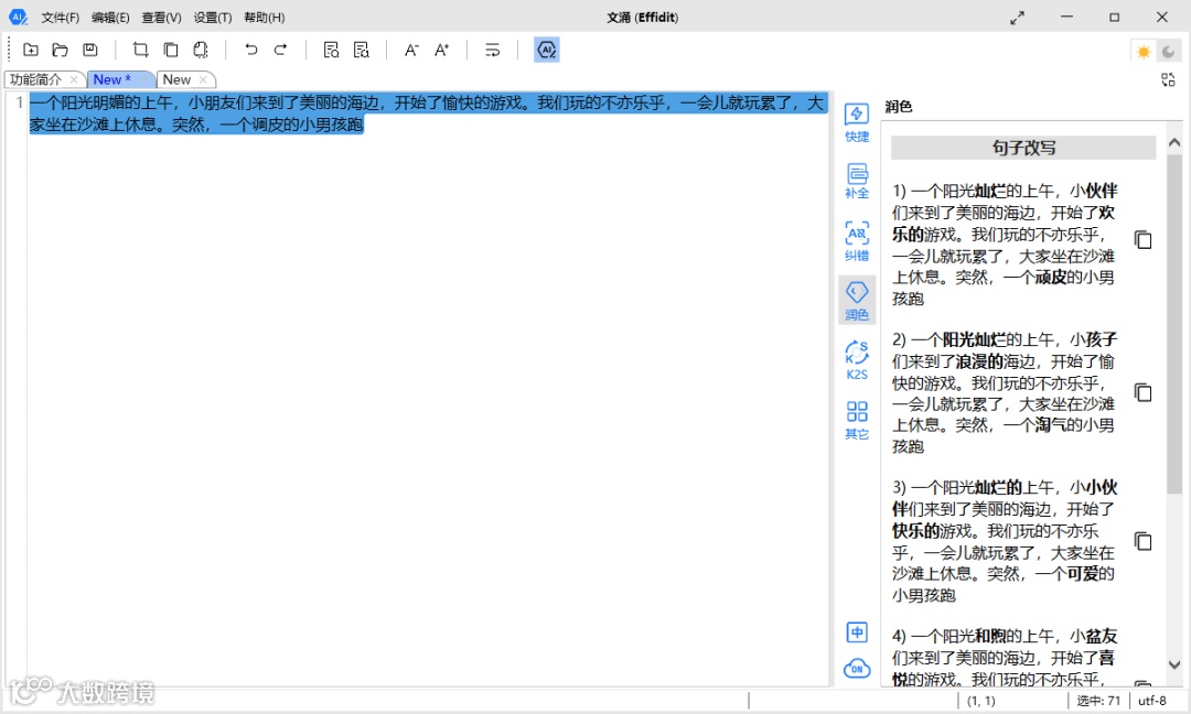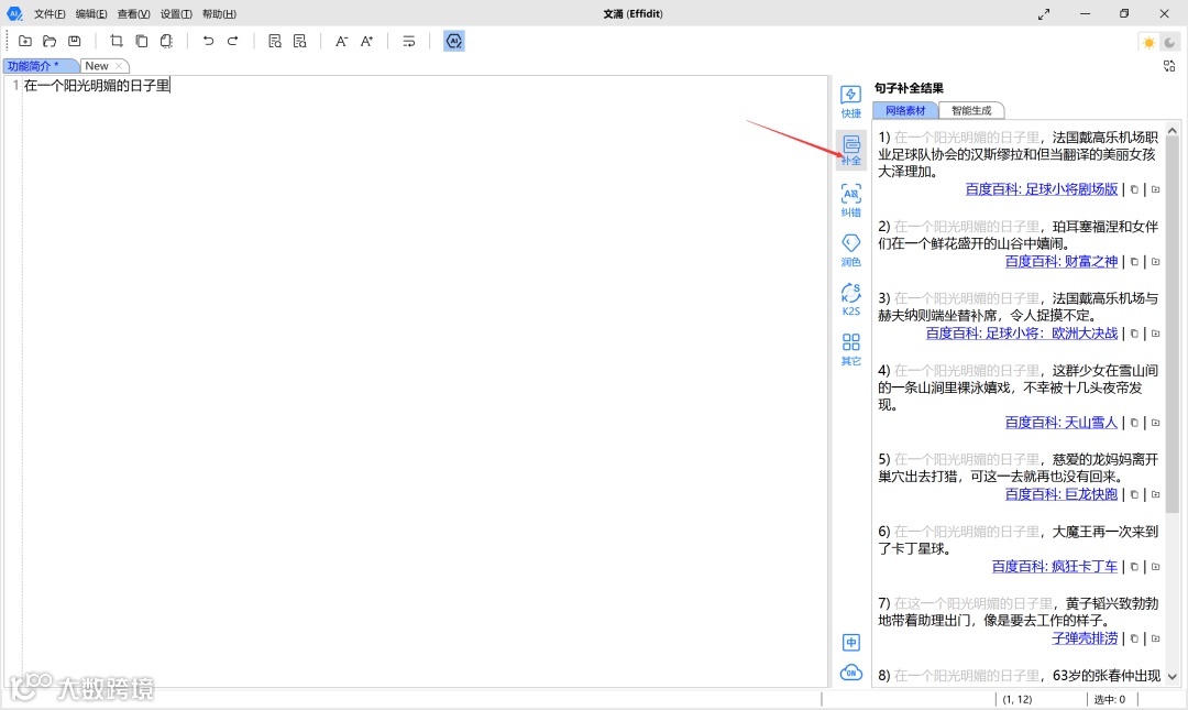 当句子写到一半,不知道下面该怎么写时,点击“补全”按钮,右侧就会给你推荐句子的结尾。