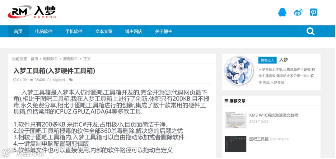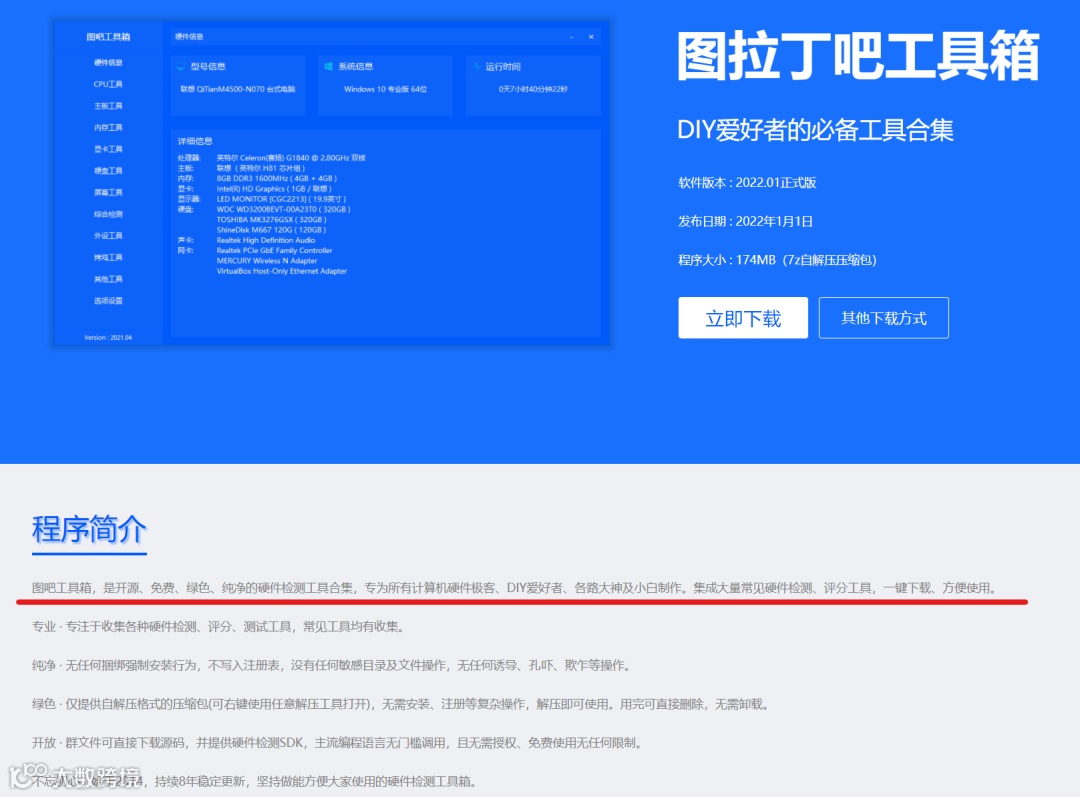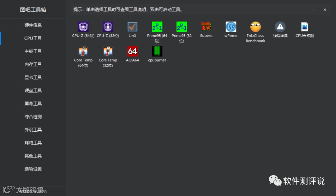 No.1 前言 今天给大伙安利一点不一样的东西,专为所有计算机硬件极客、DIY爱好者、各路大神及小白制作。 想必常年混迹显卡吧的朋友们,应该没人不知道图吧工具箱吧! 这是一款开源、免费、绿色、纯净的硬件检测工具合集,基本上从事电子硬件行业的都认识它。 图吧工具箱虽然好用,但是还是存在着不少问题,体积大杀、毒软件经常会误报病毒等问题。 所以今天我想说的并不是这个,而是一款可以完完全全代替图吧工具箱的神器,大小仅占300K左右,并且比它更好用! No.2 入梦工具箱 这款“入梦工具箱”是一名叫“入梦”的网友开发的,最后以网名“入梦”来命名的。 它仿照了图吧工具箱而开发的检测工具(绿色版本),仅300K大小的工具打开即可使用,非常便捷。 软件的左侧为工具分类栏,第一项主要用于显示硬件信息,这里能查看到你电脑的硬件信息。 像分辨率、处理器、内存、主板、显卡、硬盘、声卡、网卡和分硬盘分区,这些信息你都能知道。 除了硬件信息外,这里还有CPU、主板、内存、显卡等测试工具,每个工具类别里都包括1-20个不等的小工具。 简直可以说是专为电子硬件测评人员打造的必备神器了! 与图吧工具箱相比,这款软件最大的亮点是可以删除软件中的工具,方法是右键,选择“删除”或者“清空”。 该工具还可以自定义添加你需要的软件到工具箱中,方便桌面管理。 以上就是该工具的全部亮点了,具体怎么使用还得看我们自己。 最后,大家也不用担心软件会不会很快就失效,因为开发者将代码完全开源了(采用C#语言),并且永久免费! 下载方式 关注公众号:软件测评说 回复关键词:220115 即可免费获取软件啦! ▲扫描二维码-快速进入 你的每一个点赞、收藏、分享,都是我坚持更新的动力,感谢!