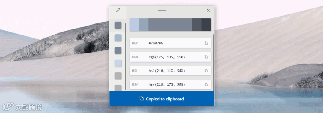 若要更详细地查看光标周围的区域,请向上滚动以放大。 复制的颜色将存储在剪贴板中,该格式默认以十六进制 (设置中) 。
