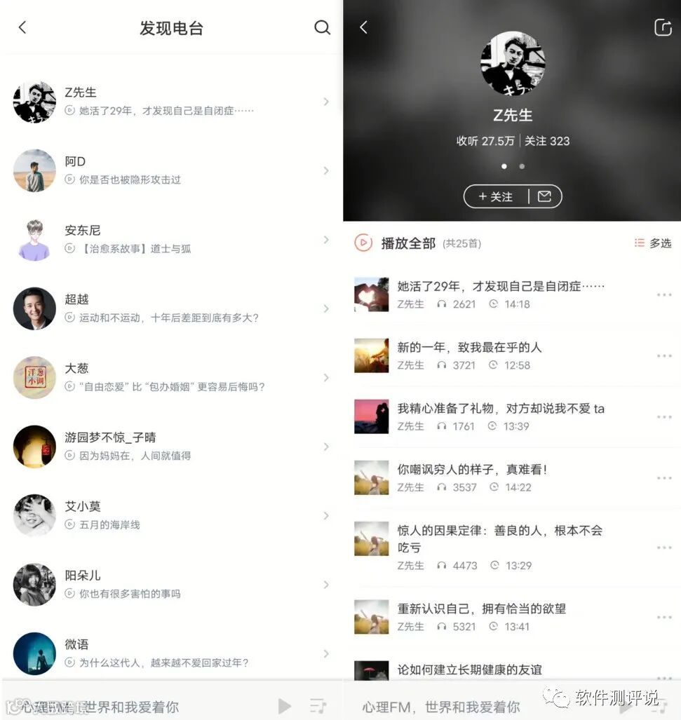 点击一个主播,就能看到收听数、关注数以及所有作品。可以通过收听量来初步判断这个主播的作品质量。