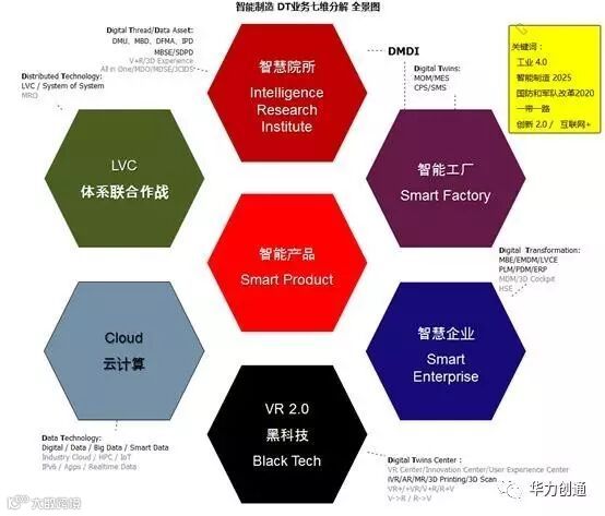在智能制造DT业务服务进程中,结合军民融合服务中产生大量的需求,华力创通采用七个维度对智能制造的业务进行了拆分,形成相应的解决方案。