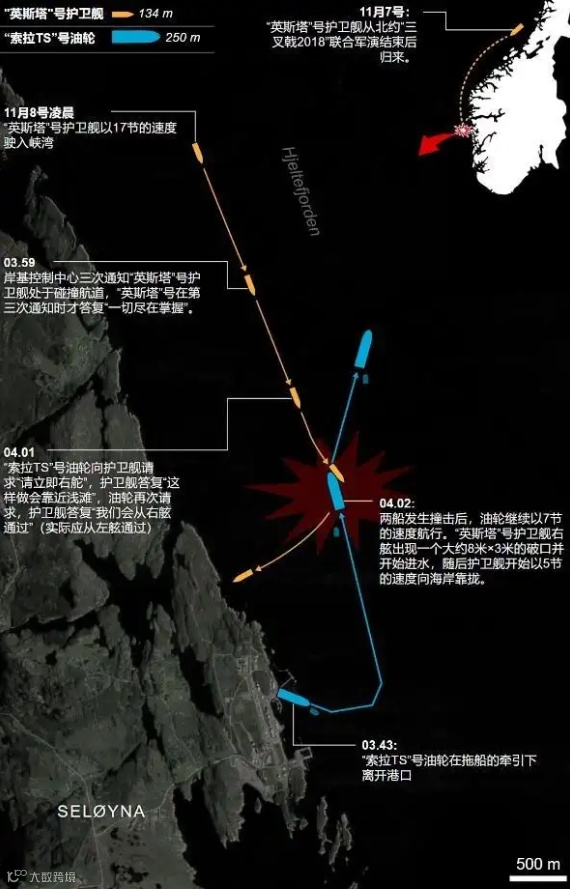2018年11月8日凌晨4点,挪威"英斯塔"号宙斯盾护卫舰在完成任务回归途中,因夜间瞭望不足、值班人员误判与其它原因,无视对向来船与对方的多次避让警告,与油轮相撞致右舷撕裂。最终护卫舰应急搁浅,全体船员弃舰。造价5亿美元的军舰5天后沉没,成为全球首艘在役时沉没的宙斯盾舰。