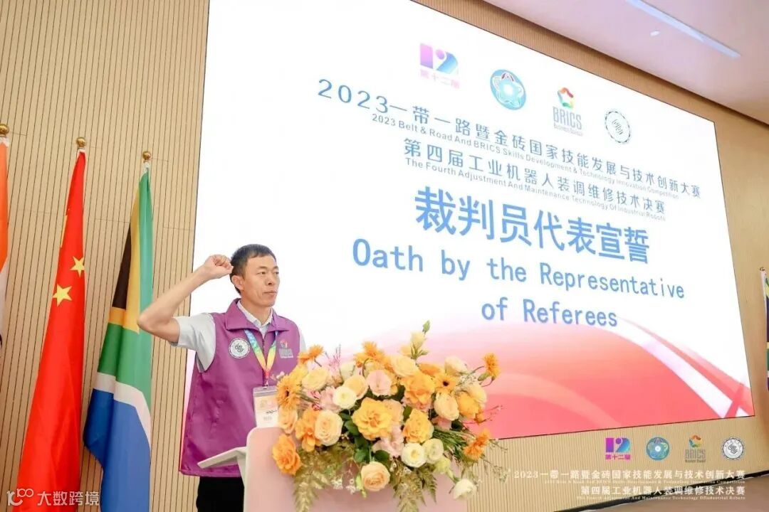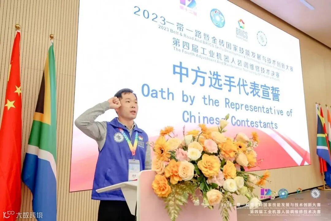 中方选手代表张均、外方选手代表阿波罗代表全体选手宣誓,将服从竞赛组委会的统一指挥,自觉维护赛场秩序;坚决执行竞赛规则,依法行事,文明参赛;尊重裁判,尊重对手;努力拼搏,赛出风格,赛出水平。