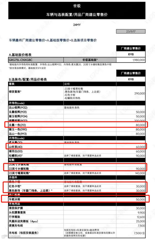 目测这台世极SUV还进行一定的选装,以网传的选配单售价作为参考,其中包括外观玄墨一色车漆(8万)、22寸水镜轮毂(9万),还有红色刹车卡钳(3万)以及黑色装饰条(3万),另外还有山吹茶内饰(6万),光是目测这些选装就超过30万。据悉,首批进入国内的车型多为统一选装包。