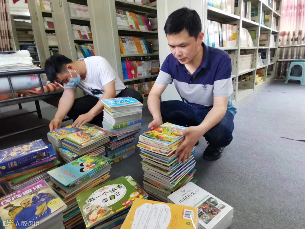 师生们正满怀喜悦地搬运、整理一箱箱书籍