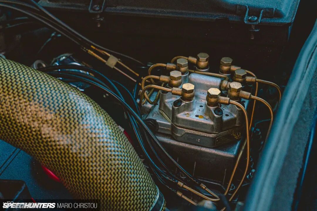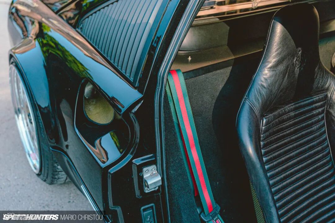 在轮毂方面,Rich选用了来自法拉利F40的锻造镁合金的BBS轮毂,拥有缎面白色和金色搭配,你可以看到镁合金部分天然粗糙的处理工艺。