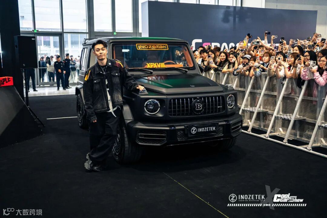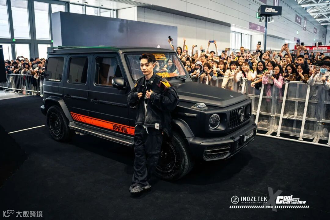 紧接着,主持人领着周柏豪、CoolCarShow主理人Jack以及INOZETEK品牌主理人Michael来到台下,一起揭晓此前打造的磨砂黑+橙色点缀涂装的AMG G63,引得现场粉丝们直呼“太帅了”。