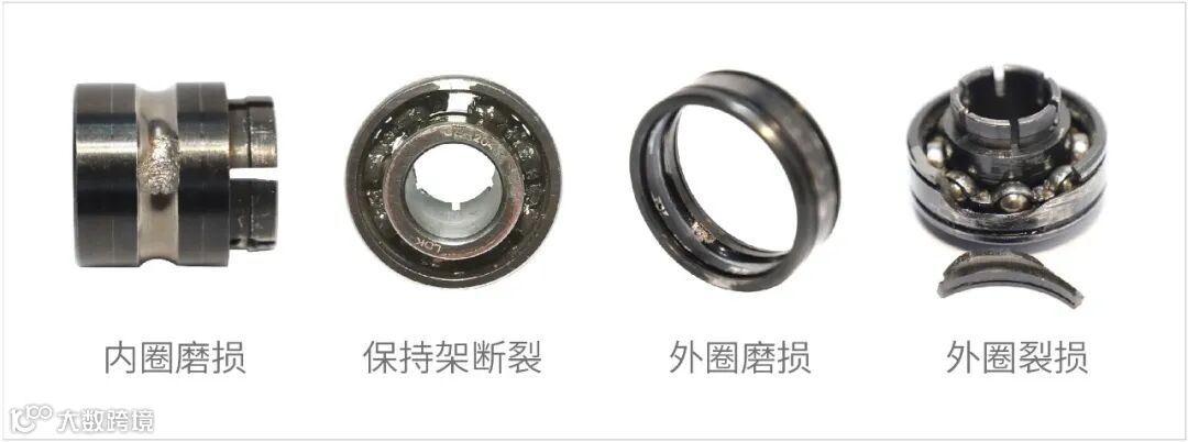 轴承故障形式主要有内圈磨损、保持架断裂、外圈磨损和外圈裂损,如图2所示: