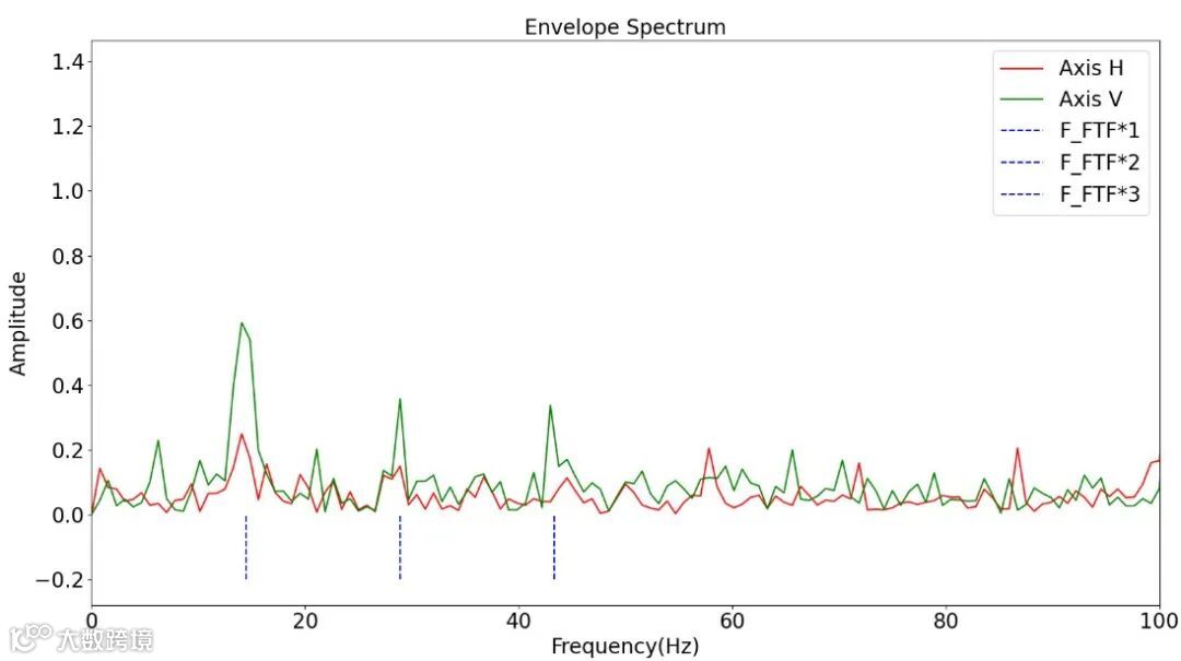 我们再次提取Bearing1_4轴承的第122包和Bearing2_3轴承的第500包数据样本做包络谱分析(如图4、图5),从中可以看出,在两种不同工况下,包络谱算法完全可诊断出轴承保持架故障。