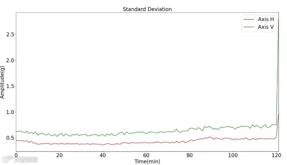 3类试验工况下15个轴承测试结果显示(如表1),发生保持架故障的轴承分别为工况1的Bearing1_4(共122个数据样本)和工况2的Bearing2_3(共533个数据样本)。接下来,我们分析这两个轴承的全寿命周期加速度标准差(如图1、图2)。