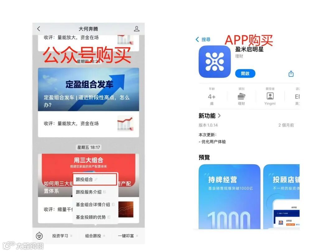 跟车定盈组合,目前支持两种方式,第一种最简单,直接通过【大何奔腾】公众号菜单下面的【跟投组合】购买,第二种就是搜索【盈米启明星app】,然后输入店铺码【6521】。