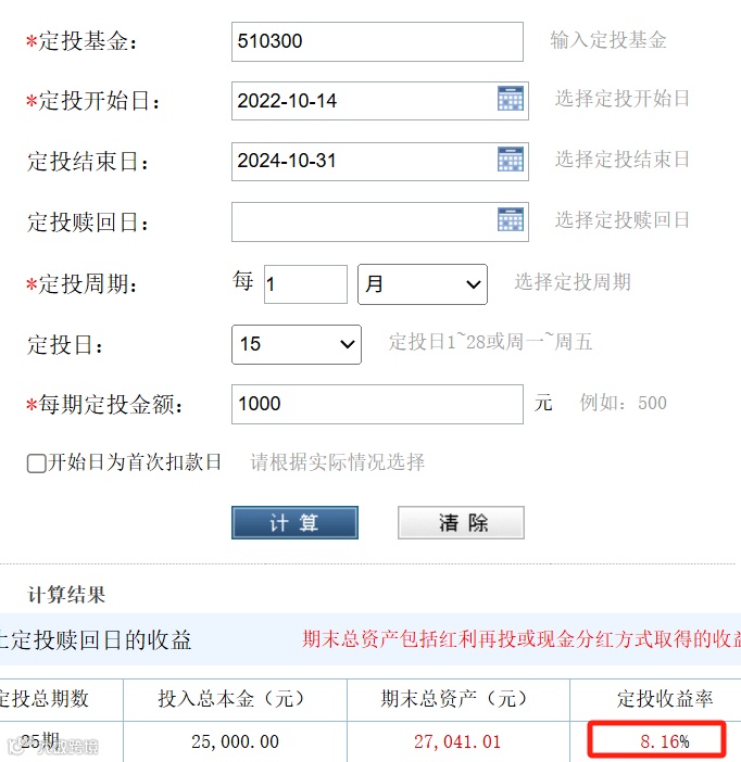 参考估值定投法,从2022年开始定投沪深300,截止24年10月,定投收益为8.16%,平均年化4%。图片来源:东方财富、理杏仁