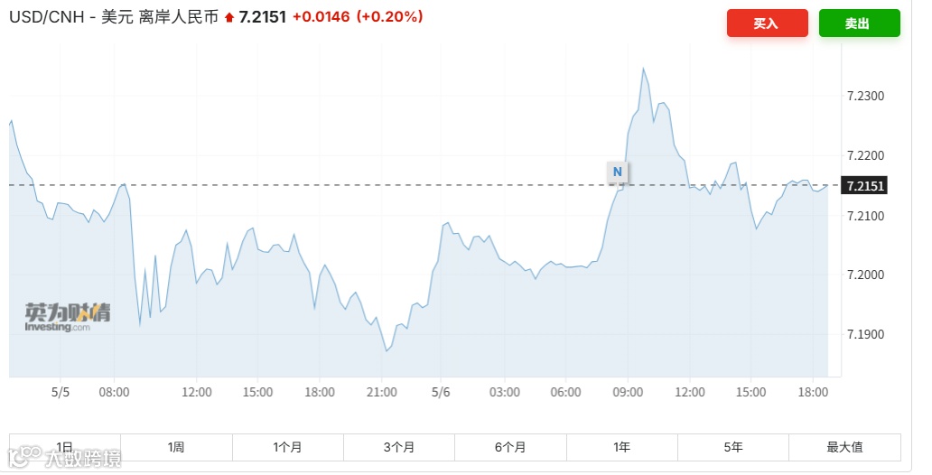 5月6日截止发稿,离岸人民币为7.22,假期涨幅超1% 图片来源:英为财情