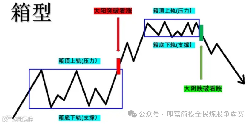 而机会把握更好的交易者,会在放量大阳突破箱体上轨压制的时候进场,或者是大阴跌破箱体下轨支撑时做空离场。