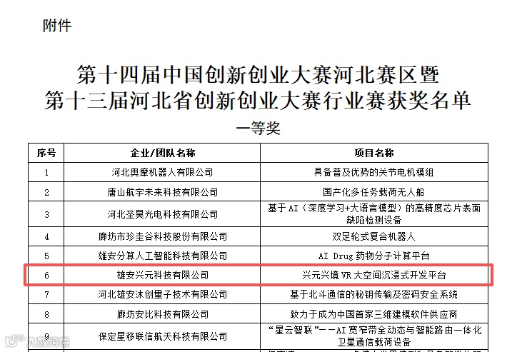 日前,河北省科技创新服务中心公示第十四届中国创新创业大赛河北赛区暨第十三届河北省创新创业大赛行业赛的获奖名单。同时,工业和信息化部火炬高技术产业开发中心也公示了大赛全国赛入围企业名单。其中,雄安兴元科技有限公司的“兴元兴境VR大空间沉浸式开发平台”项目,凭借其卓越的创新实力,在第十四届中国创新创业大赛河北赛区中脱颖而出,荣获行业赛一等奖,并成功入围全国赛。