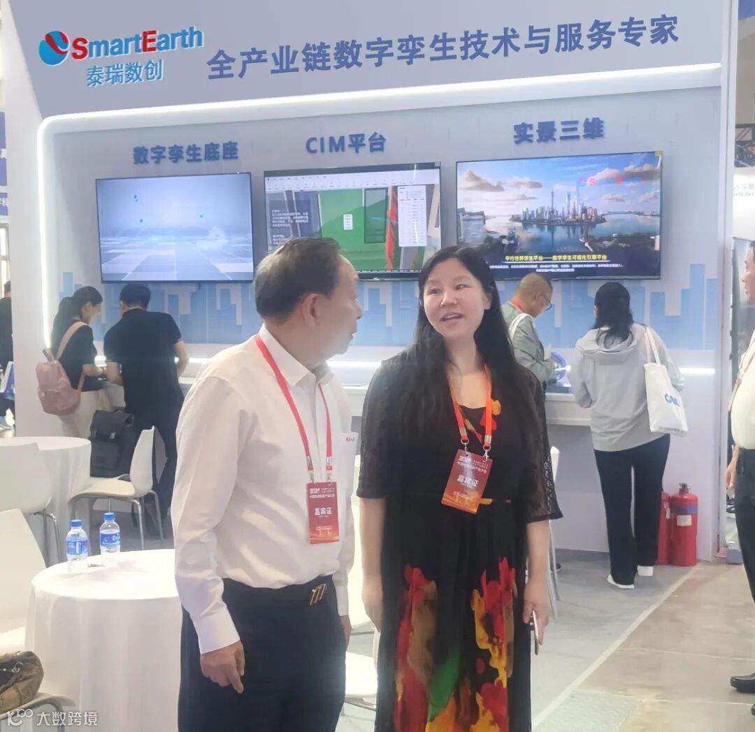 ▲ 2023年度国家最高科学技术奖获得者、中国科学院院士、中国工程院院士李德仁莅临展位参观指导与泰瑞数创科技(北京)股份有限公司高级副总裁孙东风女士进行亲切交谈