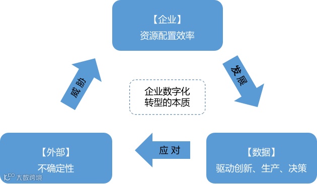 那么,企业之间竞争的本质是什么?是资源配置效率。就是看谁用更少的资源,创造出更多的产品、更好的服务。对于企业而言,从研发、设计、采购、生产、配送、服务等每个环节都会涉及到如何优化资源配置的问题。威胁企业资源配置的因素来自企业的内部外部,如:客户的需求变化,供应链生态上各个环节的变化等,这些都有可能导致风险。这种不确定的风险,本质上就是信息的滞后性与不对称性,需要以信息流带动技术流、资金流、人才流、物资流,而信息的载体就是数据。所以归根结底需要的是数据的流动。而数字化转型,就是利用数据的高效流动,对应外部的不确定性,提升企业资源配置效率,增强企业竞争力。