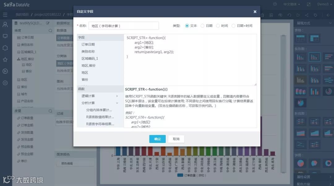 示例中使用字符串计算功能,将维度字段的地区和省份进行字符串拼接。