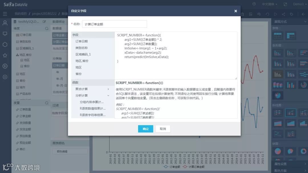 示例中使用数值计算功能,对订单金额乘以 2,然后线性回归拟合。