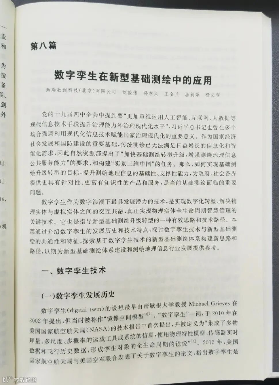 泰瑞数创此次参与撰写的报告第八篇《数字孪生在新型基础测绘中的应用》通过介绍数字孪生的发展历史和技术特点,探讨数字孪生技术与新型基础测绘的共通性和特征,探索基于数字孪生技术的新型基础测绘体系构建新思路和路径,以期为新型基础测绘体系建设和测绘地理信息行业发展提供思路。