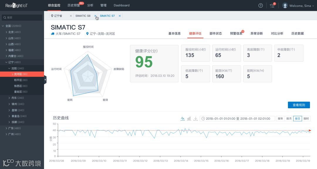 为设备的健康度打分、可了解健康分数构成、变化趋势、对比排序。
