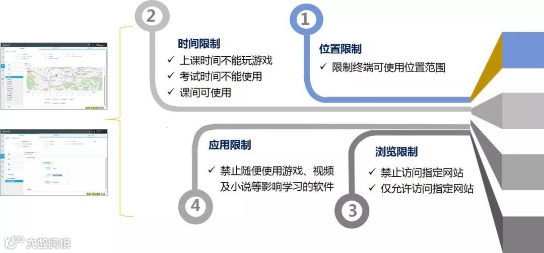 从时间、位置、应用及浏览几个方面对教学平板的使用进行限制,既人性化地限制了平板使用的范围,又屏蔽了不良信息对学生学习的影响。