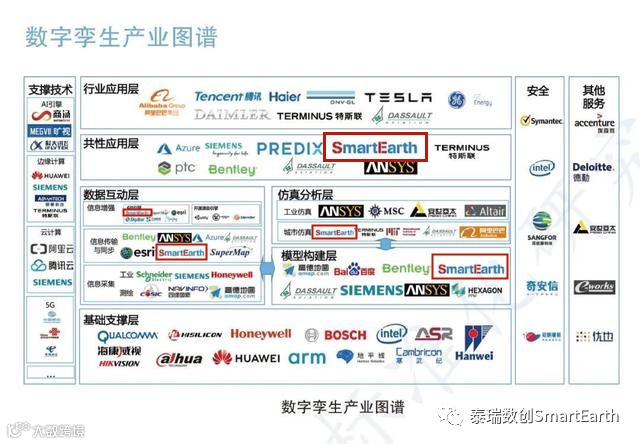数字孪生产业图谱分为支撑技术、基础支撑层、数据互动层、模型构建层、仿真分析层、共性应用层、行业应用层、安全、其他服务9大板块,其中泰瑞数创SmartEarth在模型构建层、数据互动层、仿真分析层、共性应用层等几大板块中都被作为代表位列其中,是入选次数最多、覆盖面最广的企业。可谓名副其实的数字孪生全产业链技术与服务提供商。