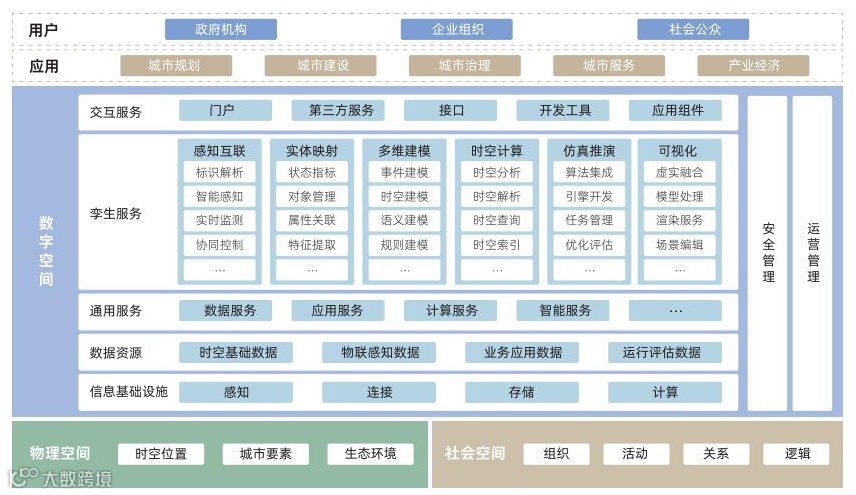 城市数字孪生是对物理空间以及社会空间中的物理实体对象、事件对象以及关系对象进行数字空间的虚拟表达以及映射,通过信息基础设施的转化传输以及处理形成数据资源,在通用服务能力的支撑下进一步融合数字孪生技术形成能够对外提供的数字孪生服务,并通过交互服务实现与上层应用场景的融合。同时,需提供立体化安全管理以及全生命周期的运营管理,保障数字空间各类资产以及服务的安全高效运行。