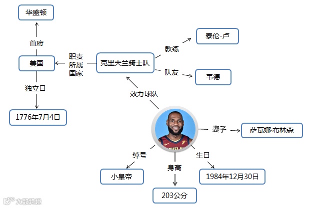 在知识图谱的定义中有两个词明确了知识图谱的组成,即“节点”和“边”。“节点”和“边”提供的“关系”也就是知识图谱最有效的表示方式。以勒布朗·詹姆斯给大家举个例子: