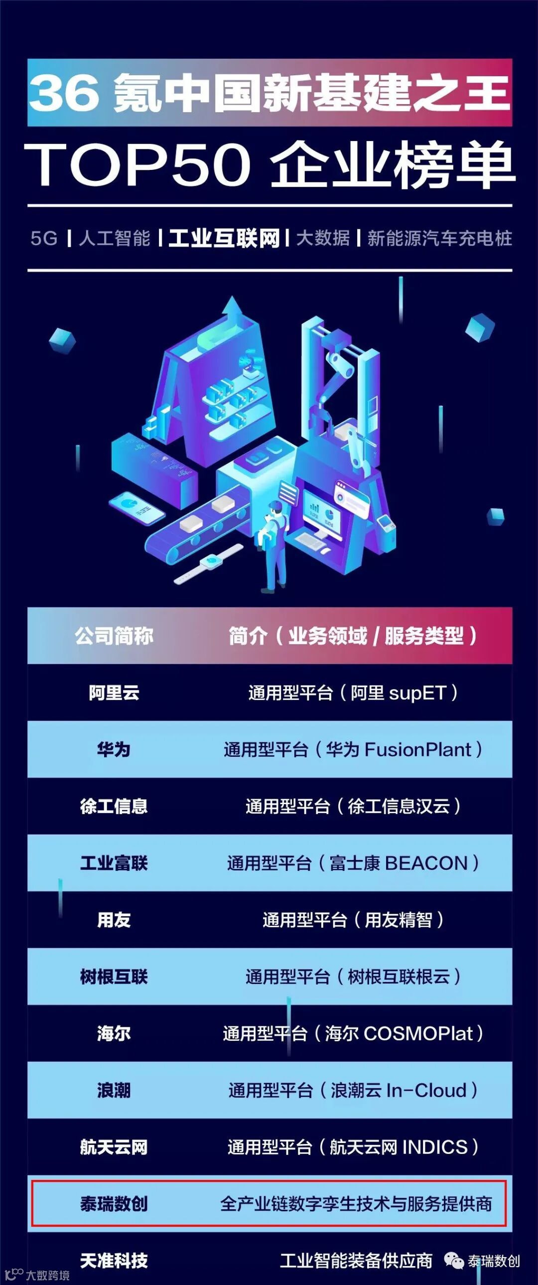 近日,36氪通过深度梳理工业互联网企业发展情况,重磅发布新基建之王「工业互联网领域」TOP50企业榜单。泰瑞数创作为全产业链数字孪生技术与服务提供商,凭借着强劲的资本价值力、研发与创新力、产业影响力荣耀登榜,一起登榜的还有阿里云、华为、徐工信息、用友等50家实力雄厚的优秀企业。