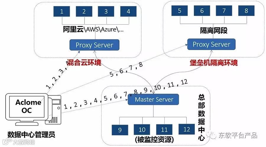 在企业 IT 环境中,涉及多个公有云平台或者企业内部堡垒机等隔离网段的情况下,东软 SaCa Aclome 的分布式采集架构,通过在云端以及隔离网段中部署采集 Proxy 代理,与中心端服务进行资源的实时同步与告警的实时通知,保障管理人员对所管 IT 资源健康的及时掌控,实现一致的管理模式与操作体验。