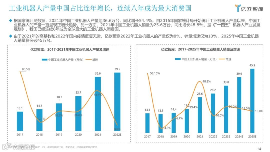 机器人被誉为“制造业皇冠顶端的明珠”,其研发、制造、应用是衡量一个国家科技创新和高端制造业水平的重要标志。自“十三五”以来,我国 机器人产业蓬勃发展,尤其是工业机器人。2021年,中国工业机器人销量为25.6万台,同比增长48.8%,已经连续8年成为全球最大的工业机器 人消费国。